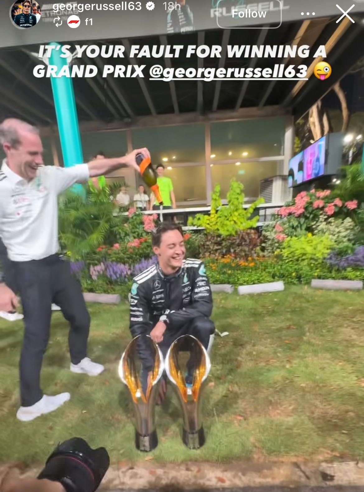 The Singapore GP ended up being a fun race to watch, (albeit with Ferrari underperforming) and George Russell from Mercedes earning the win. As per tradition drivers spray champagne during the podium ceremony which appears to have been done with Moët. After the ceremony the team was taking pictures and filming content of their celebration and George Russell posted to Instagram of himself being showered by what appears to be Mionetto Prosecco.