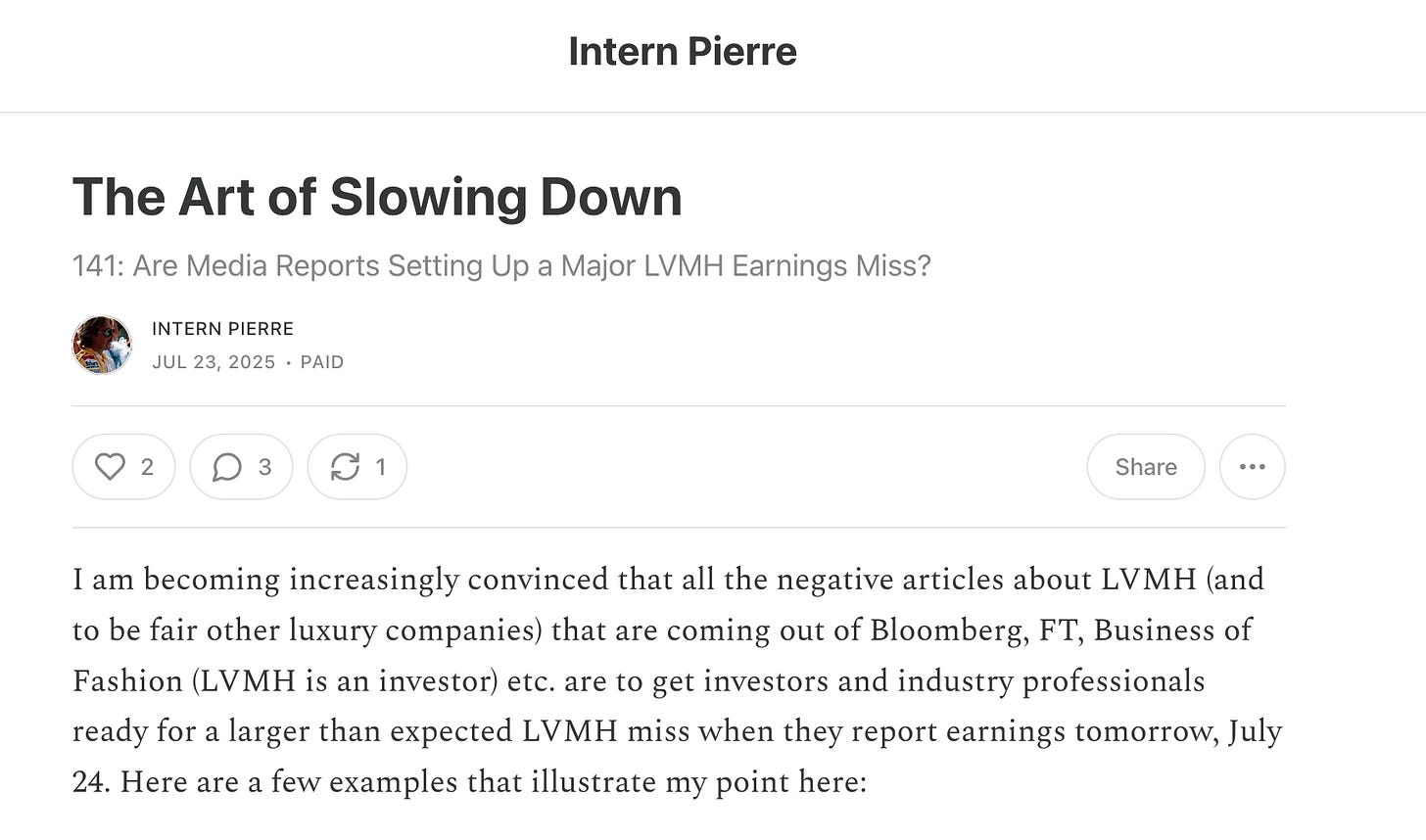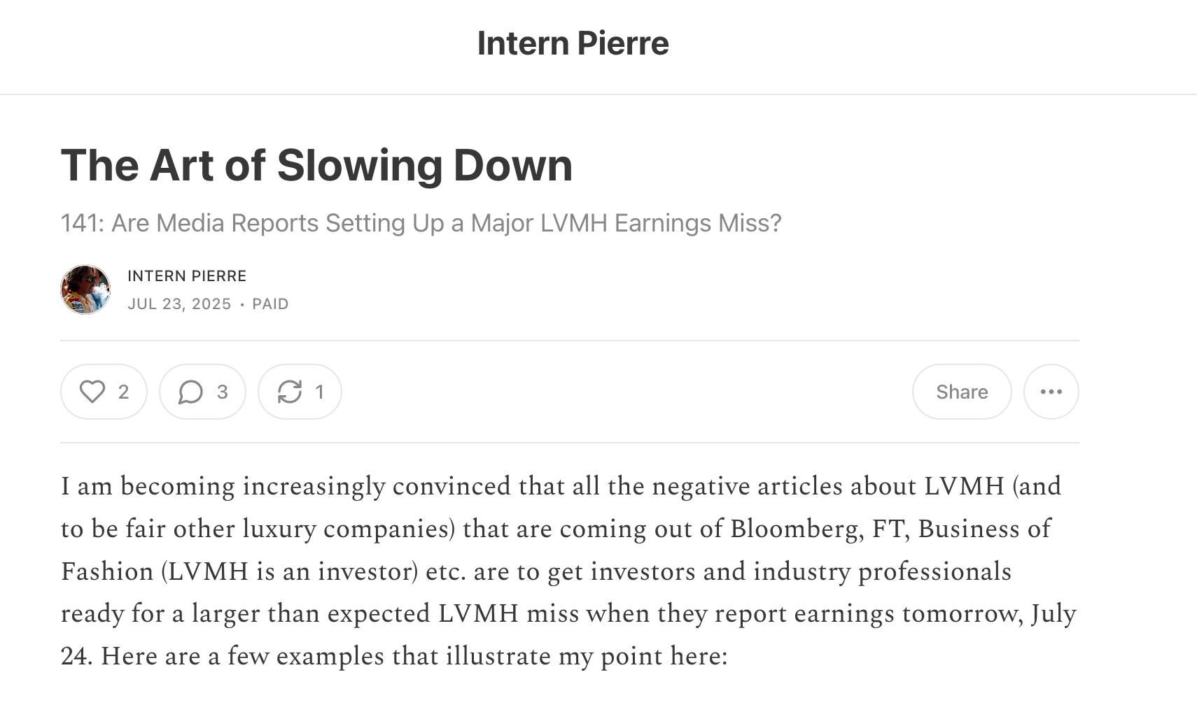 If anybody at LVMH is interested in having a discussion I’m always happy to do so and it may be helpful seeing that I’ve been consistently accurate from piecing together publicly available information. Enjoy the last summer Friday in July and for those of you (like me) who are on holiday for August have an excellent time with your family and friends!