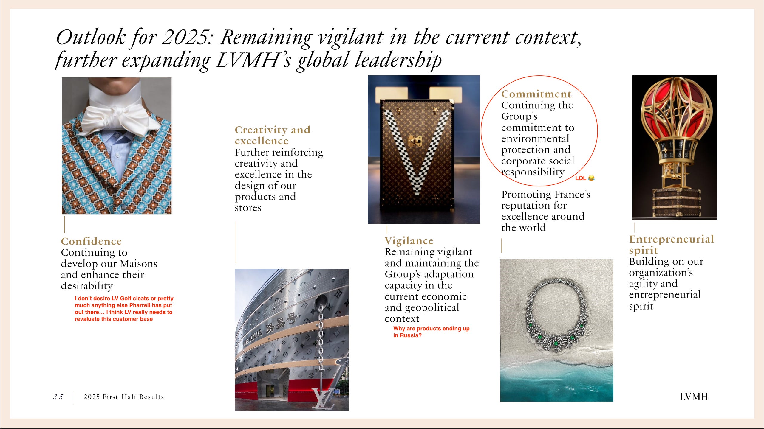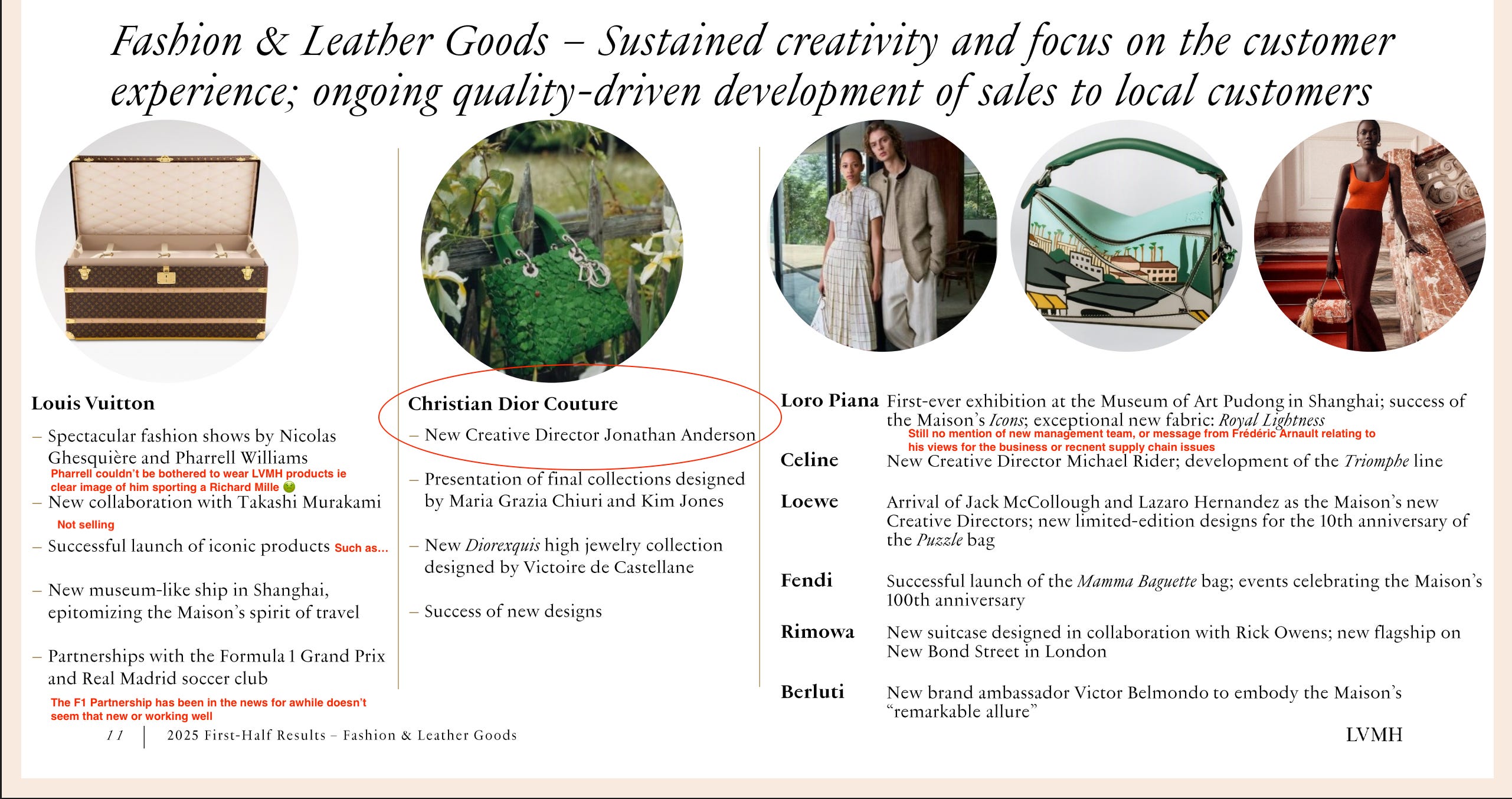 As I mentioned, revenue and profit for the Fashion and Leather Goods division was abysmal. In fact the performance was so bad that the slide on “positives” focused on sales to local (ie European) customers and creativity. I’ve included my notes and comments on the slide below: